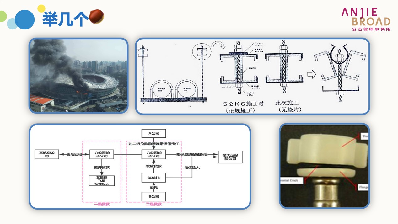 我们再来看一些追偿案件的例子,感受了解被保险人与追偿对象之间的关系是不是对控制承保风险有帮助。1,申花队主场虹口足球场火灾,涉及到企财险追偿,起火点是一个室内攀岩馆,原因可能是攀岩馆内设备问题,涉及租赁合同,其实攀岩馆投保有公责险;2,生产液晶屏的洁净厂房被淹,企财险追偿,由于动力系统冷却水管吊装工程没做好,漏装承重垫片,追施工方,设计工程合同,施工方有安工险;3,出口北美的产责险,水管接头漏水把老美家里淹了,产责只保了经销商没保生产商,向生产商追,涉及买卖合同;4,二手飞机第一轮融资用抵押增信,第二轮融资用履约保证保险增信,保险人如果赔款,追投保人,涉及贷款合同。这些合同条件当然影响承保风险,如果这些合同下的救济权利被放弃了,承保风险会被放大。