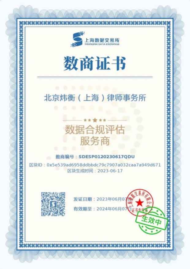 炜衡上海所获上海数据交易所认证“数据合规评估服务商”