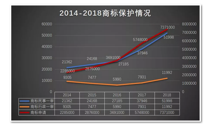 多组数据表明,我国行政机关及人民法院对商标保护的力度不断加强。2018年,全国法院新收商标行政一审案件11992件,同比上升51.2%;新收商标民事一审案件51998件,同比上升37.03%;国家知识产权局受理商标注册申请737.1万件,同比上升28.8%。与往年相比,2018年继续延续了从2016年以来的“三增长”趋势。