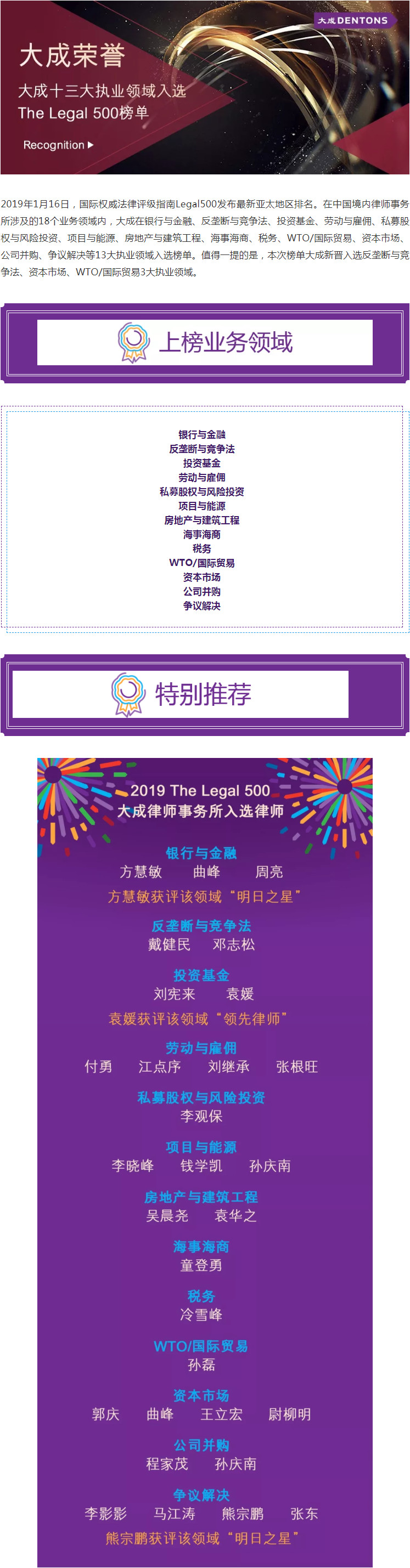 2019 The Legal 500亚太地区榜单,郭庆律师为大成“资本市场”领域入选律师