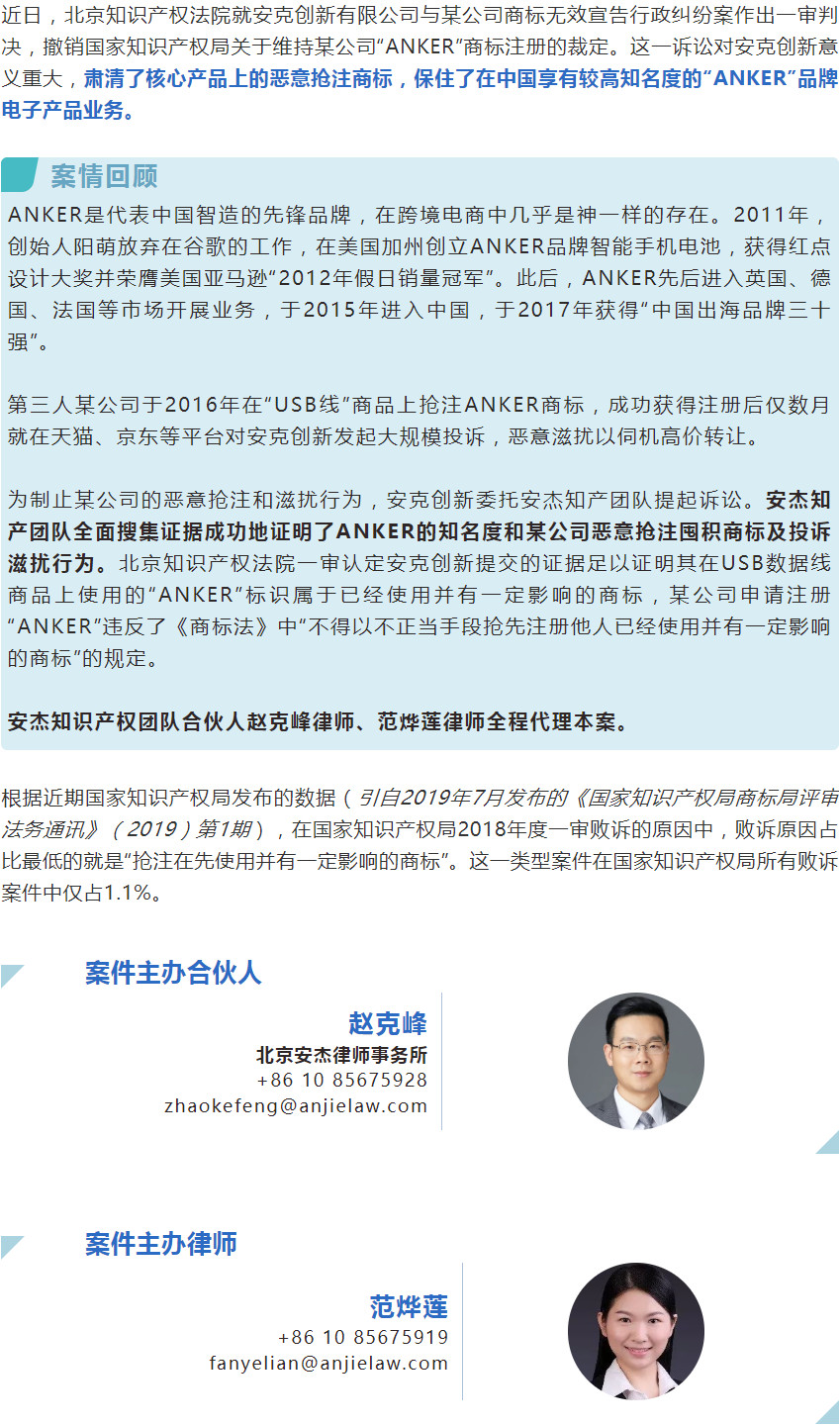 安杰代理中国智造“ANKER”品牌打赢商标无效宣告行政诉讼