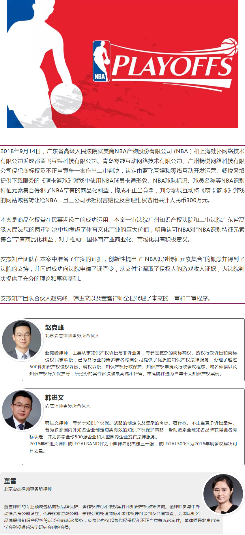 安杰代理NBA起诉《萌卡篮球》游戏胜诉,获赔300万元