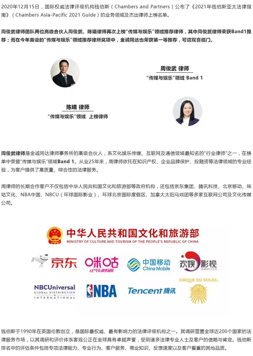 荣誉 | 周俊武律师团队两位律师荣登钱伯斯2021年亚太法律指南榜单