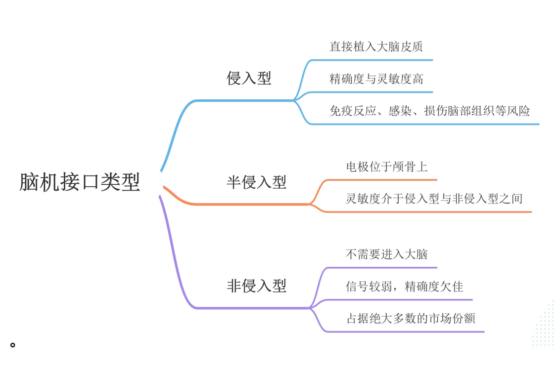 脑机接口可分为三大类:a.侵入式,通过神经外科手术直接植入大脑皮质,此种方式获得的数据精确度与灵敏度高,但是存在免疫反应、感染、损伤脑部组织等风险;b.半侵入式,侵入性没有那么强,但仍然需要进行脑部手术,电极位于颅骨上;c.非侵入式,不需要进入大脑,只需要穿戴设备记录大脑皮层的表面信号,如脑电帽、耳蜗等,此种方式获得的信号较弱,精确度欠佳。[2]目前来看,非侵入式仍占据绝大多数的市场份额。