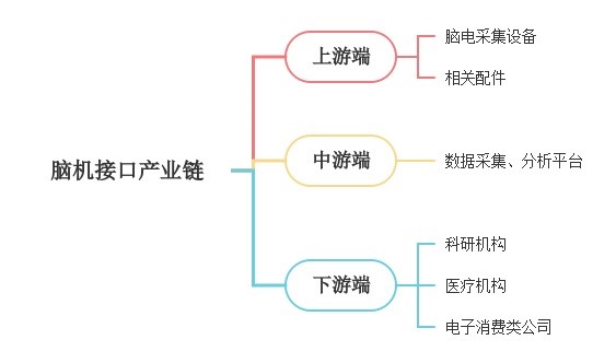 目前,脑机接口产业链大致可分为:以脑电采集设备及相关配件生产产商为主的产业上游端,以脑电数据采集平台、脑电数据分析平台为主的产业中游端,以科研机构、医疗机构、电子消费类公司与个人为主的产业下游端。[4]
