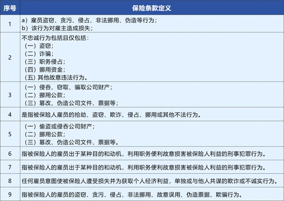 目前,我国众多商业保险公司均推出“雇员忠诚保险”此类险种。对于“不忠诚”行为的解释,多数商业保险公司采用列举的方式,亦有保险公司未对“不忠诚”进行定义,仅采用“不忠诚行为”等类似表述。