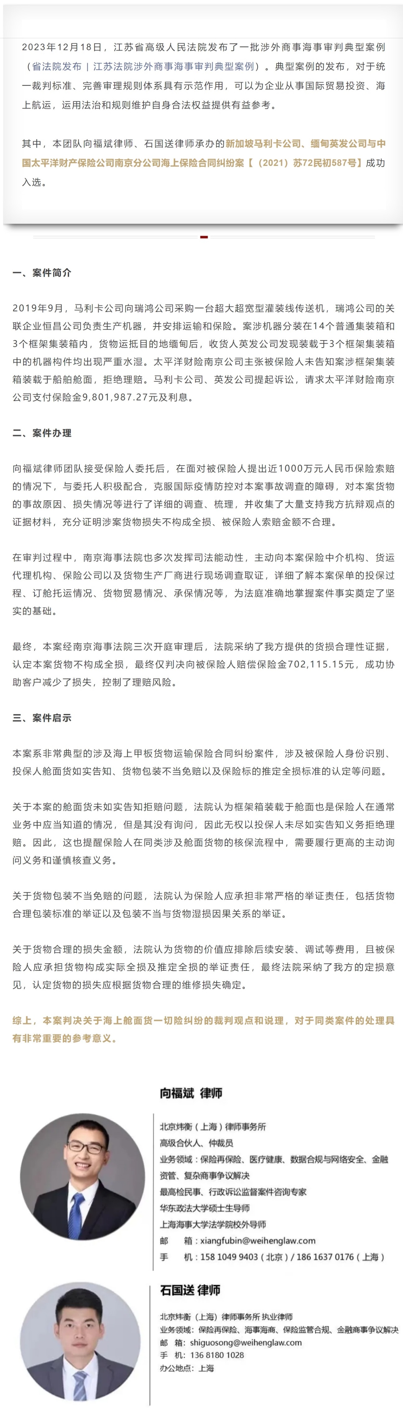 荣誉 | 向福斌律师、石国送律师代理江苏太保处理的某保险合同纠纷入选江苏法院涉外商事海事审判典型案例