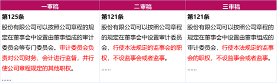 以股份有限公司为例,从上述新《公司法》一审、二审、三审稿的条款变化可以看出,审计委员会的职权由一审稿“对公司财务、会计监督的职权”扩大至“监事会的职权”,即公司可以设置审计委员会取代监事会,行使监事会职权。