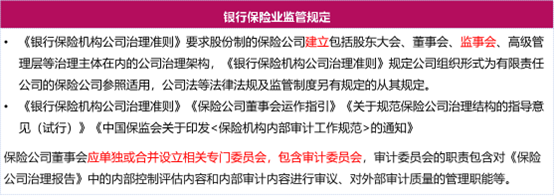 对于保险机构,按照现行监管规定,应当实行监事会与审计委员会并行运转的模式,但监管规定下的审计委员会≠新《公司法》下的审计委员会。前者主要职责范围为内外部审计事项,而后者为公司整体监督机构。