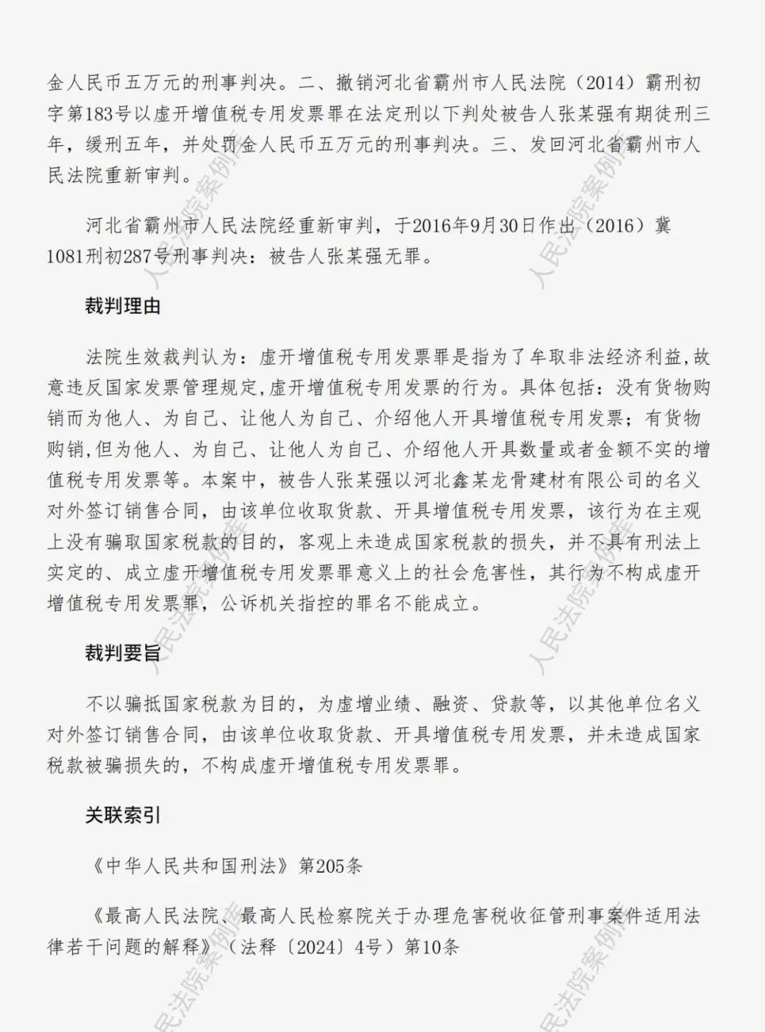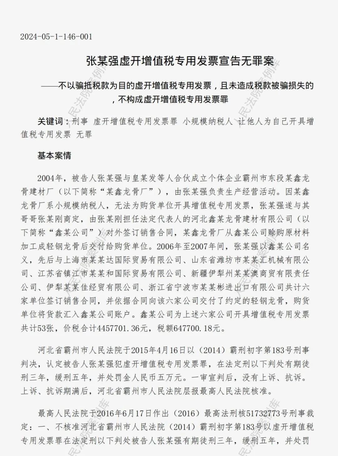 事实上,在《解释》出台之前,司法实践已经开始尝试突破97《批复》所做规定,在2019年最高法人民法院充分发挥审判职能作用保护产权和企业家合法权益典型案例(第二批)中,张某强虚开增值税专用发票案(【2016】最高法刑核51732773号刑事裁定书)即以最高法认定其“不具有骗取国家税款的目的,未造成国家税款损失,其行为不构成虚开增值税专用发票罪”,最终做出无罪判决(见下图)。2024《解释》可谓不孚众望。