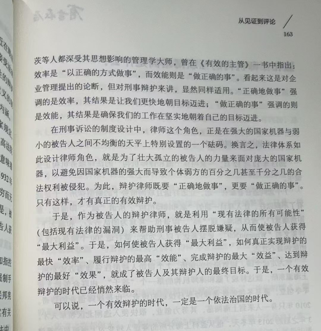 有效辩护这一概念,如今在我们刑辩律师的圈子中经常被提及,它强调的是辩护的质量和效果,要求律师的辩护不仅要合法合规,更要能够切实维护被告人的合法权益,推动实现司法公正。桂明老师通过亲身深入的观察和研究,不仅为我们清晰地梳理了刑事辩护发展的脉络,更是为我们指明了前进的方向。在这样的启发下,我将更加努力地投身于刑辩事业,为推动实现司法公正和有效辩护而不断努力。